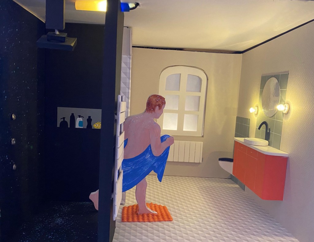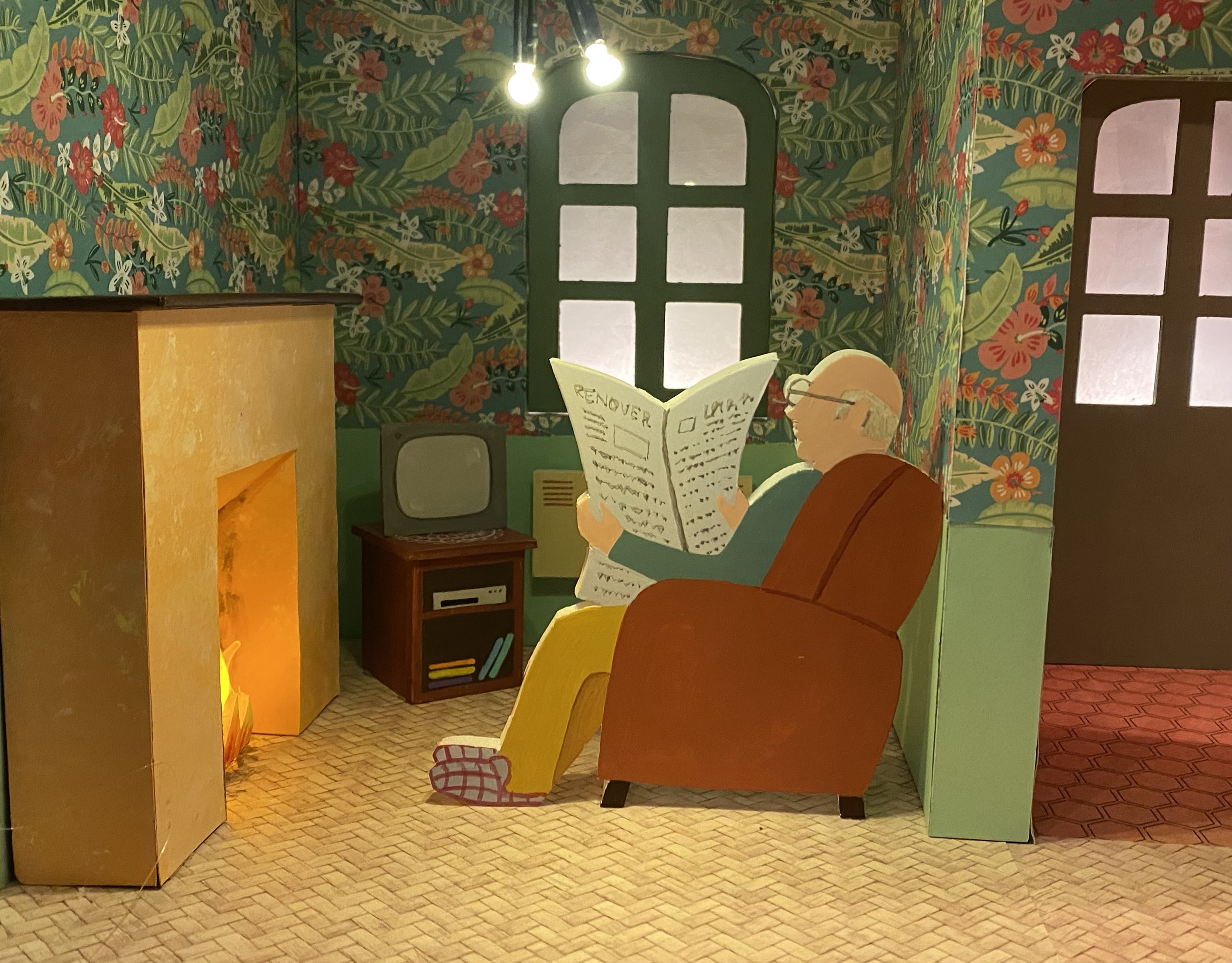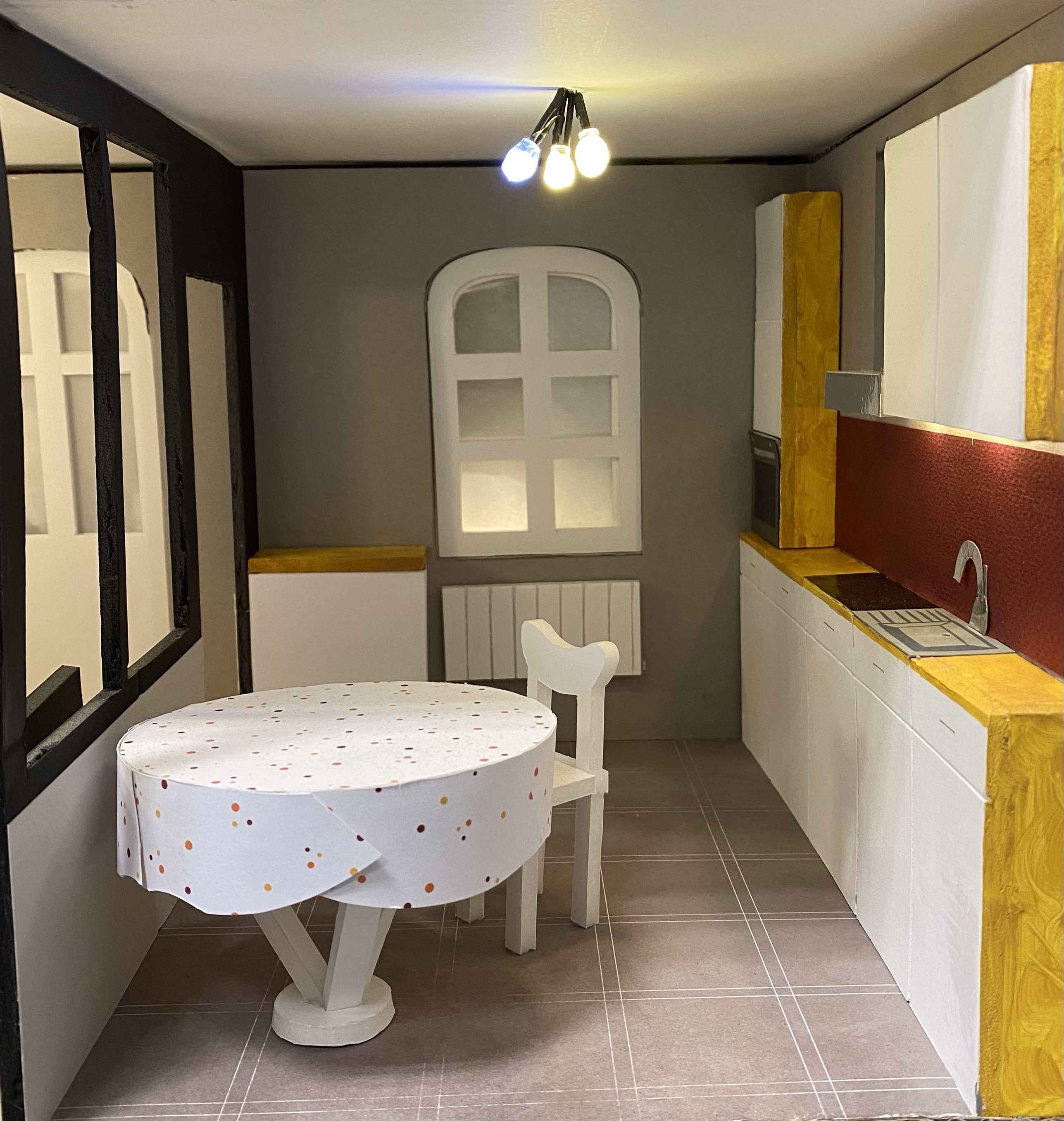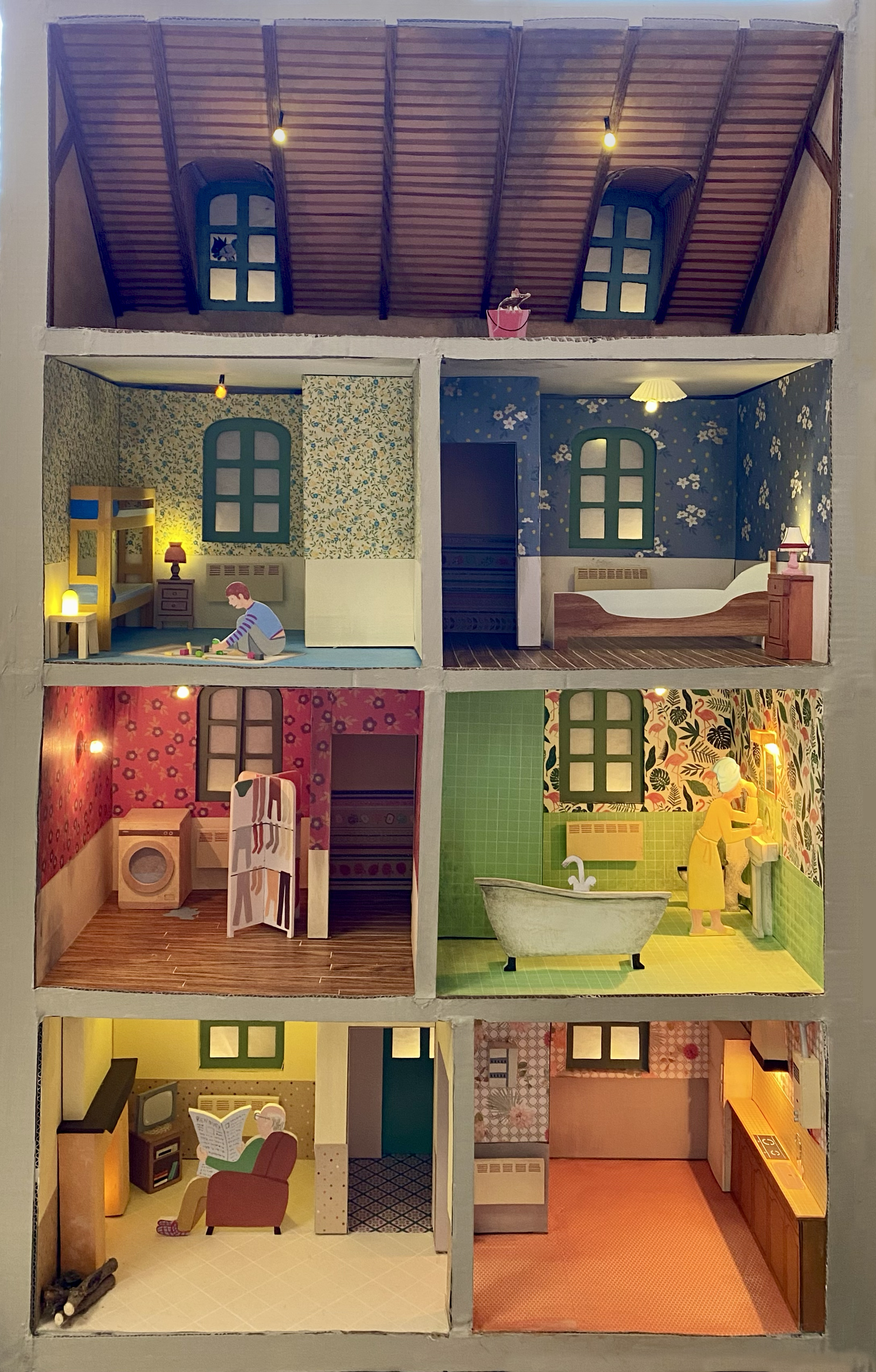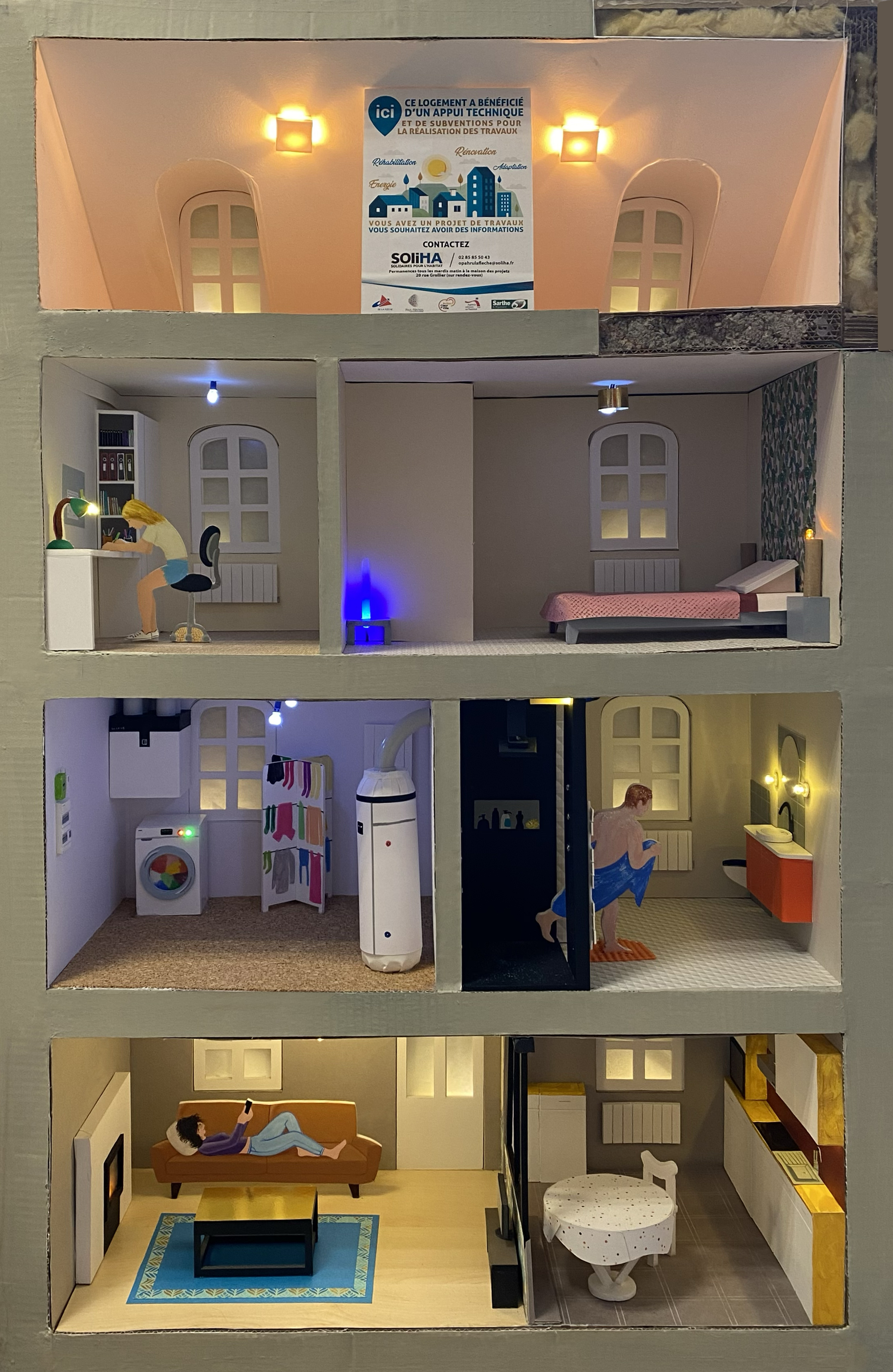 Conception et réalisation de Maquettes Pédagogiques habitat dégradé vs rénové // Soliha Pays de la Loire // dimension 120x70x35cm // Carton, papier et peinture acrylique // mise en lumière Nicolas Vuillet // 2023