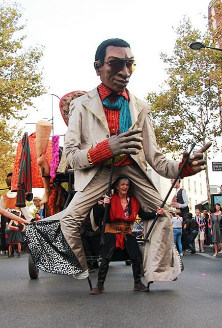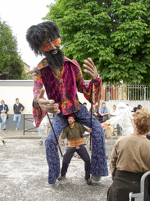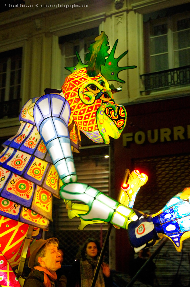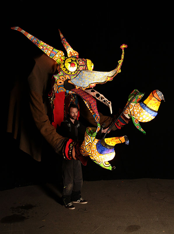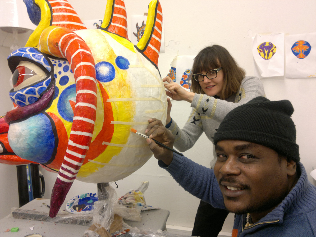Travail en duo sur la tête d’une marionnette géante avec un collègue peintre haïtien : Vady ConfidentFabrication et peinture de marionnettes géantes en papier mâché translucide // Parade de la Fête des Lumières // Lyon 2014Fabrication et peinture de marionnettes géantes // D’après une idée originale de C.Evette et J.Martin, créateurs de la Cie Les Grandes Personnes // 1997-2018
